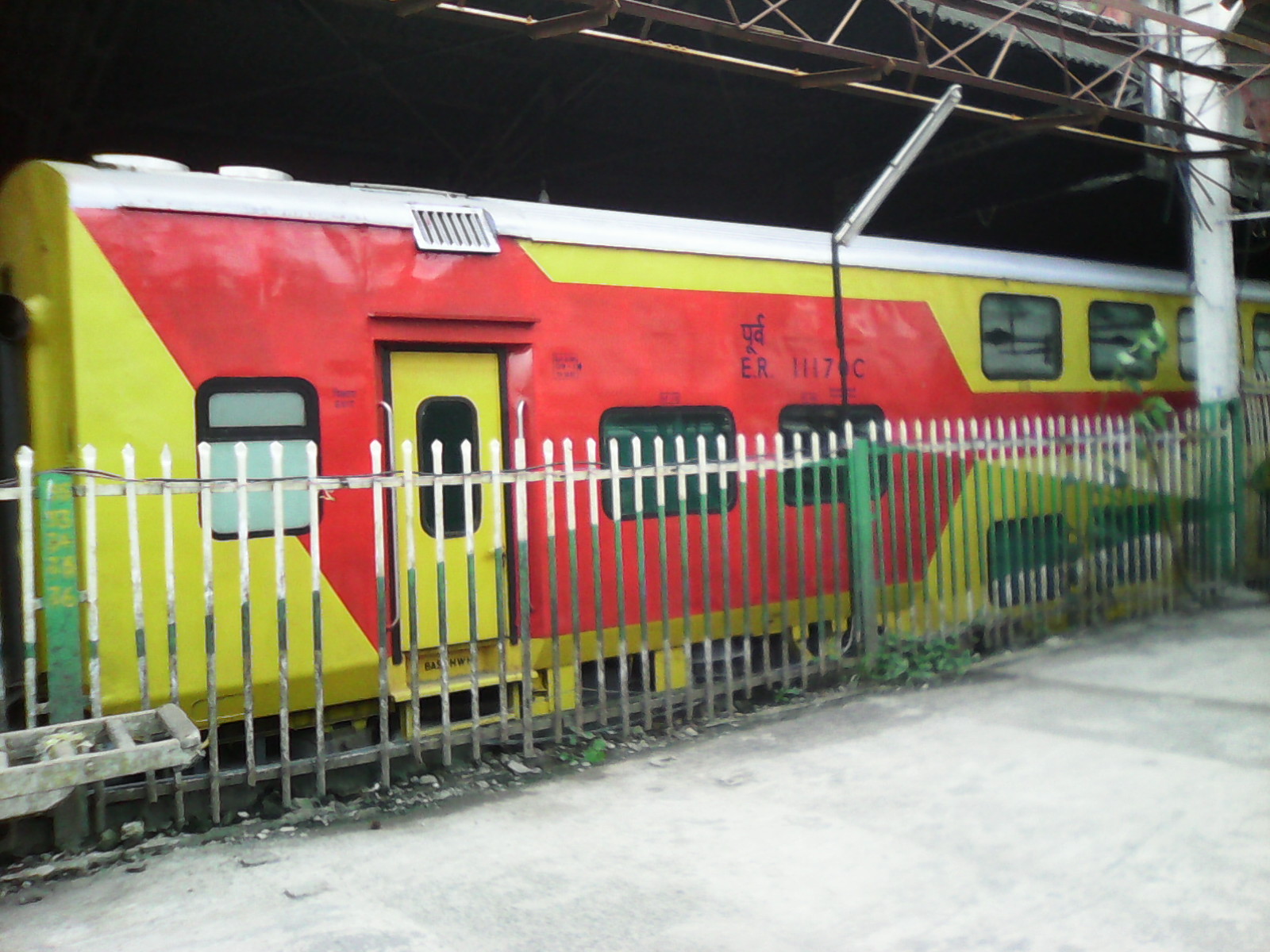 I went up to the under repair platform number 15,to have a good look at the train. Really Pitiable condition!Dust had gathered all around,some of the windows panes were broken, urchins were making merry on the roof. I went up to take some pictures of the train. Those urchins suddenly became very shy and ran away! Meanwhile the lady on the PRS crooned "............ HWH-MECHEDA LOCAL 13 no platform theke charbe.......repeat in Hindi and eng..."